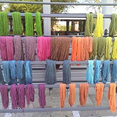 Er zijn verschillende workshops, spinnen voor beginners, domino breien en natuurlijk wolverven.