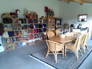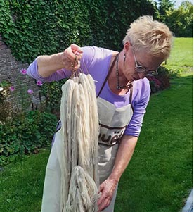 Ze geeft workshops als het koud is binnen in het ruime atelier en lekker met de kachel aan, als het mooi weer is, buiten onder de notenbomen.